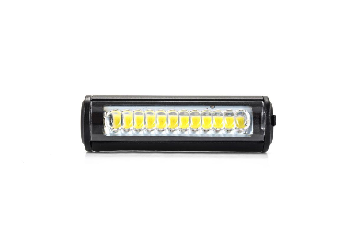 Sicherheitslicht "weiß" mit 12 SMD LEDs, 120 Lumen, integrierter Lithium-Polymer-Akku, 6 Lichtfunktionen, 2-stufiger Batterieindikator, spritzwassergeschützt, Silikonbandbefestigung, integrierter Befestigungsclip