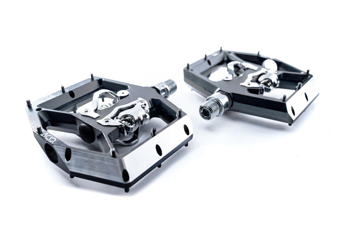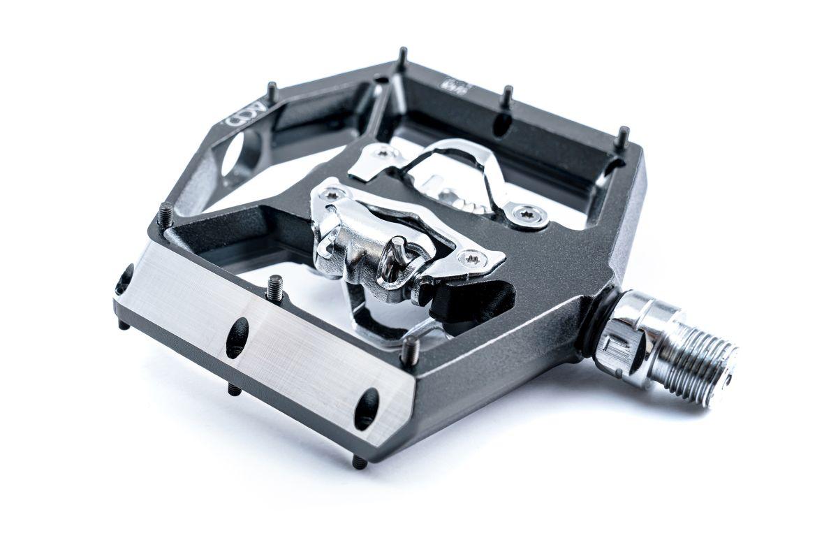 Click Flat-Pedal mit beidseitigem Klick-System, SPD-kompatibel, CNC-veredelter Aluminiumkörper und CrMo Achse, angefaste Kanten für erhöhte Bodenfreiheit in Kurven, große Standfläche, extrem flache Bauweise, 16 austauschbare und einstellbare Pins, gedichtete Industrielager