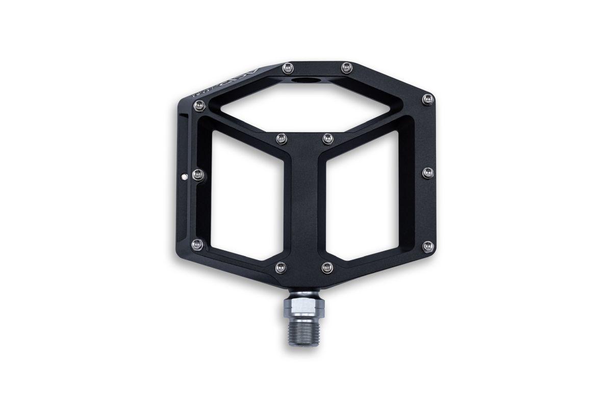 leichtes Flat-Pedal, Aluminiumkörper und CrMo Achse, angefaste Kanten für erhöhte Bodenfreiheit in Kurven, große Standfläche, flache Bauweise, zwölf Pins pro Seite, LSL-Bushing, integrierte Reflektoren
