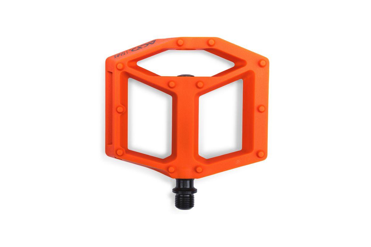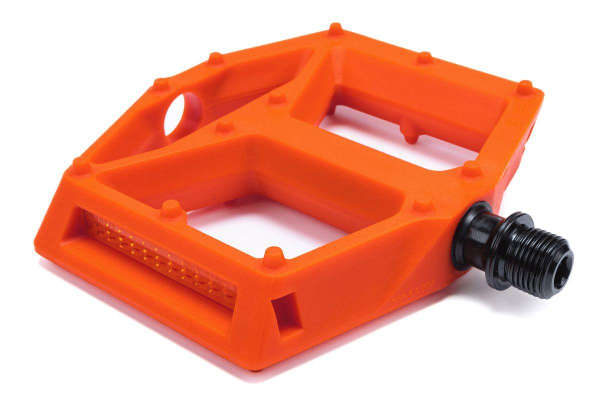 leichtes Flat-Pedal, Nylon-verstärkter-Kunststoff-Körper und CrMo Achse, angefaste Kanten für erhöhte Bodenfreiheit in Kurven, große Standfläche, flache Bauweise, zwölf Pins pro Seite, LSL-Bushing, integrierte Reflektoren