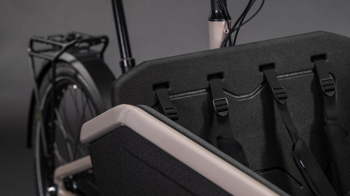 Unser Cargo Hybrid Family kommt als sichere, vielseitige Familienkutsche daher, die riesig Spaß macht, egal wohin die Reise geht. Die Kindersitzbank mit inkludierten Anschnallgurten findet in der robusten Transportbox aus EPP-Schaum Platz, Regenverdeck inklusive. So haben die Eltern den Nachwuchs immer im Blick: Und der Nachwuchs? Genießt die Aussicht. Nimmt man die Kindersitze heraus, wird das Bike zum potenten Packesel für Ladung mit bis zu 200 kg Systemgewicht. Sein langlebiger Aluminiumrahmen hat einen Aufnahmepunkt für den Bosch Cargo Line Motor, der im Team mit dem 800 Wh starken Akku bis zu 100 Nm Drehmoment bereitstellt. Wer noch mehr Kapazität und Reichweite braucht, kann per PowerMore Option weitere 250 Wh nachrüsten. Dazu kommt ein kleines Staufach für persönliche Gegenstände. Clever: Per integriertem Schloss, das mit dem optionalen Kettenschloss kompatibel ist, lassen sich sowohl das Bike als auch das kleine Staufach absperren. Was noch? Der integrierte Kettenschutz hält die Kleidung sauber und per Mittelbauständer mit verlängerten Füßen wird das Bike ganz einfach abgestellt. On top haben wir das Steuersystem überarbeitet – so ist der Wendekreis deutlich kleiner und das Fahrverhalten spürbar einfacher und intuitiver.