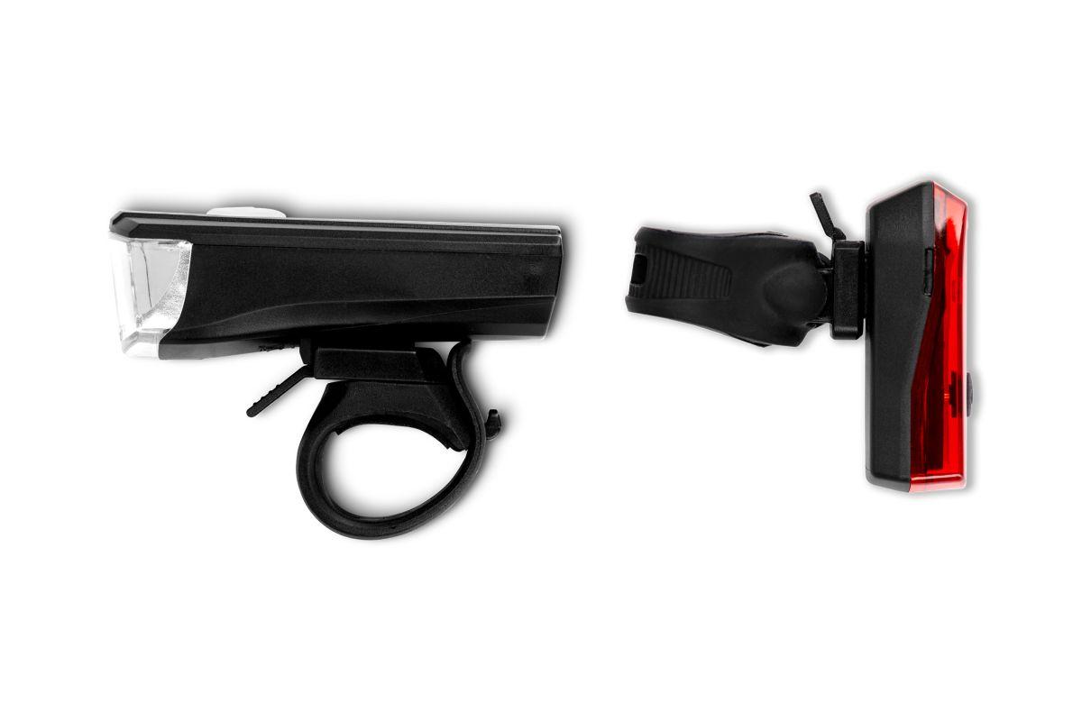Das batteriebetriebene LED-Frontlicht hat eine Leuchtkraft von 20 LUX und wird mit einer hochqualitiativen, einstellbaren Halterung am Lenker befestigt. Das passende LED-Rücklicht ist mit zwei Batterieanzeigestufen ausgestattet und wir mit einem flexiblen Gummiband angebracht. Beide Lampen sind spritzwassergeschützt und damit ideal geeignet für nasses Wetter. Natürlich ist das Lichtset nach der deutschen Straßenverkehrsordnung (StVZO) zertifiziert. Batterien enthalten.
