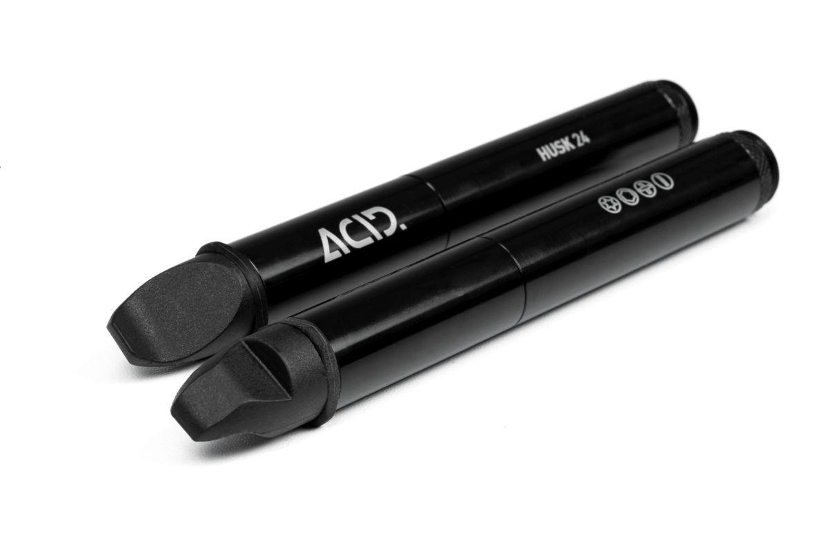 Ein hochwertiger Werkzeugkoffer auf kleinstem Raum und in coolem Design – das ist das ACID Multitool HUSK 24. Die zwei Metall-Tubes mit Reifenhebern an jeweils einem Ende liegen perfekt in der Hand. Im Inneren finden 23 weitere Funktionen Platz – gut geschützt vor Schmutz. Der Kettennieter und die BIT-Aufnahmen sind für bessere Hebelwirkung um 90° klappbar. Die beiden Tubes des HUSK 24 können mit dem ACID GILink für HUSK dezent im Lenker versteckt oder mit den ACID Rahmenhalterungen am Flaschenhalter montiert werden.