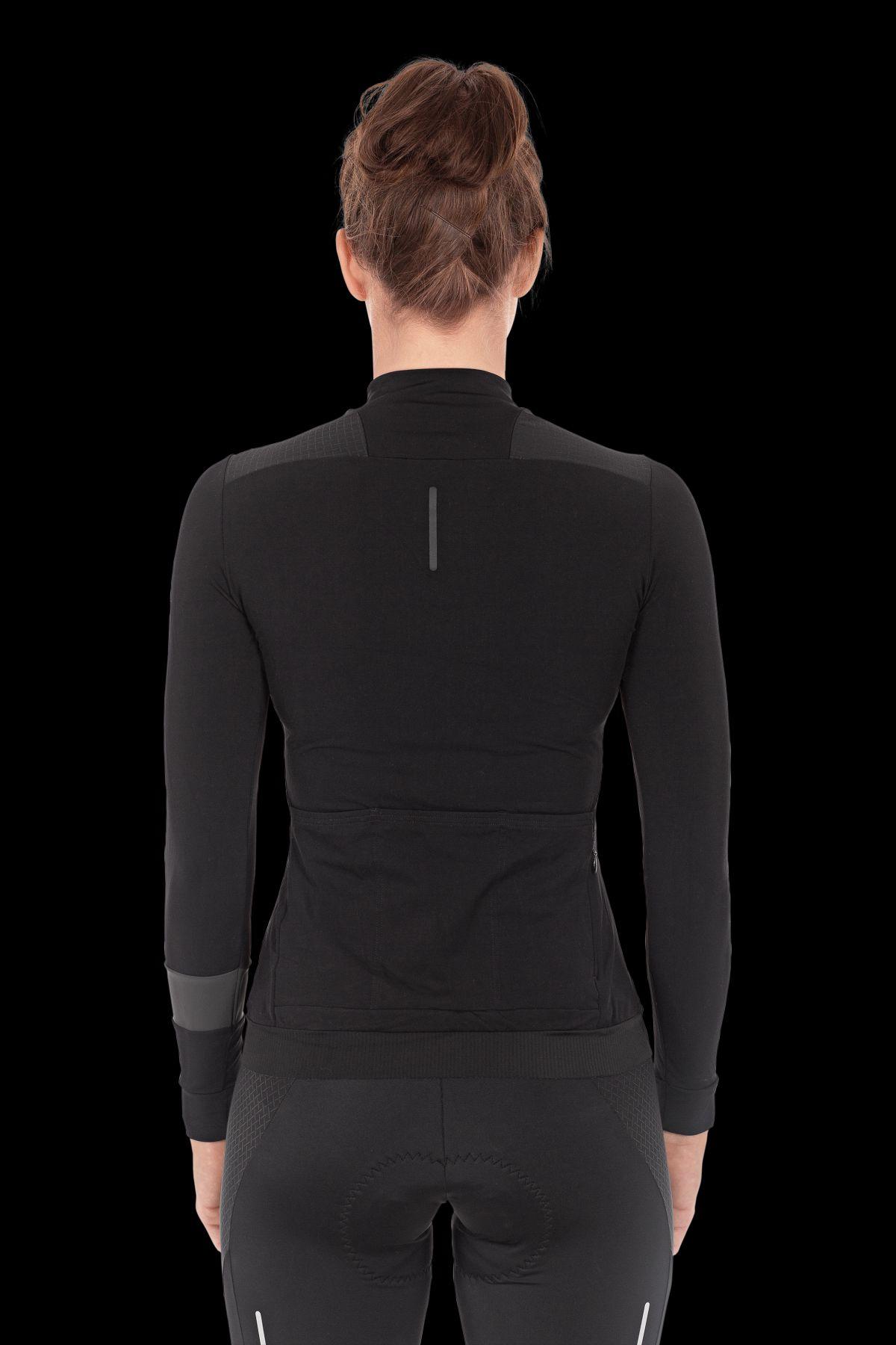 enganliegend, weicher Innensaum mit breitem Silikonband, durchgehender Frontreißverschluss, 3-teilige Rückentasche, wasserabweisende Reißverschlusstasche hinten, schnelltrocknendes, wärmendes Funktionsmaterial, nahtfreier Schulterbereich, reflektierende Elemente, Model ist 168 cm groß, Model trägt Größe S