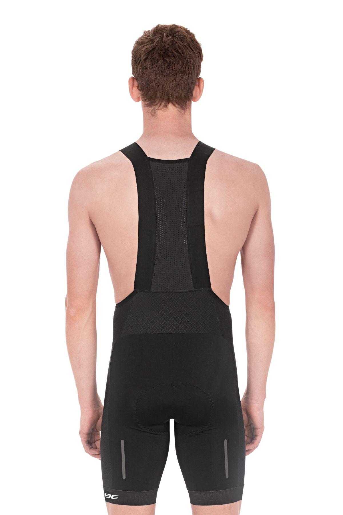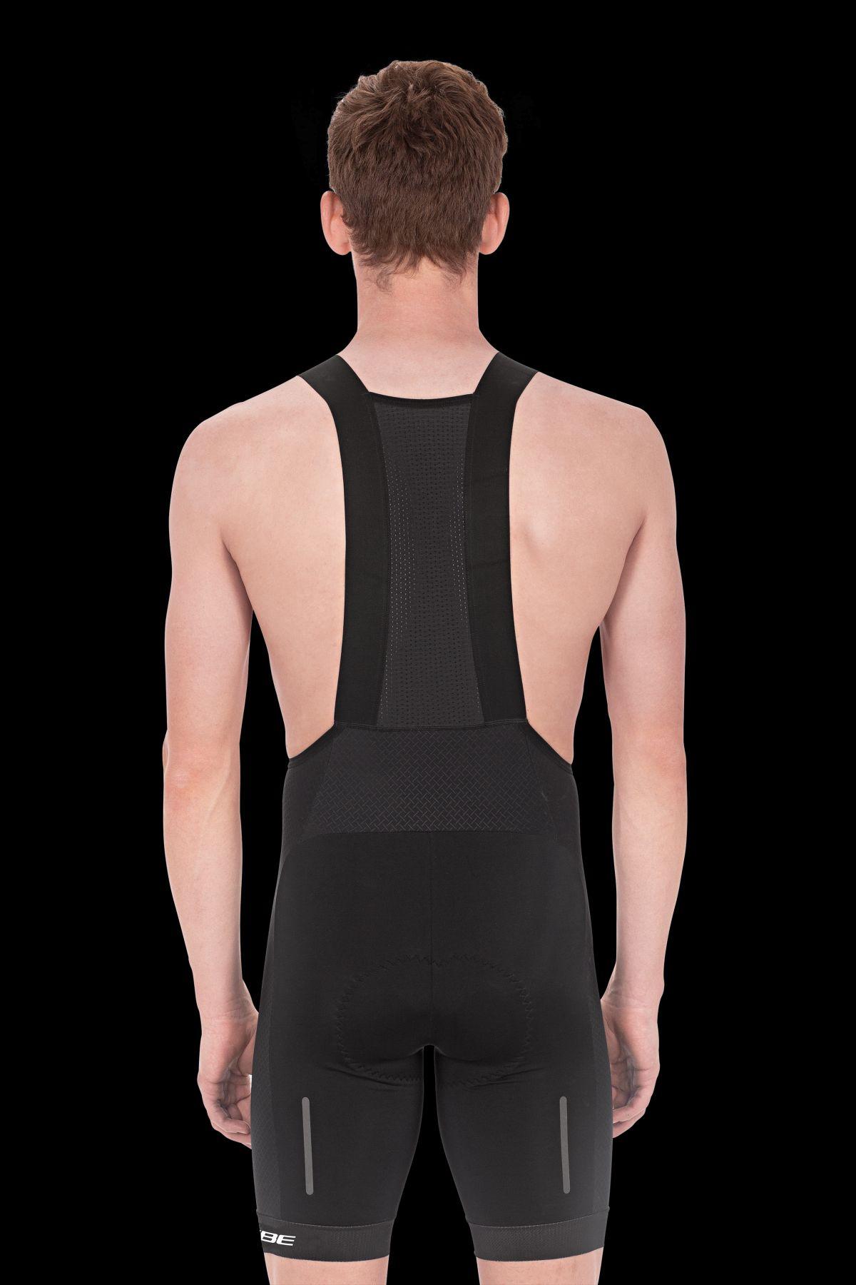 widerstandsfähiges und schnelltrocknendes Funktionsmaterial, reflektierende Elemente, weicher Innensaum mit breitem Silikonband, anschmiegsame Schulterträger, atmungsaktiver Mesh-Einsatz im Rückenbereich, CUBE Team Pad - hergestellt in Italien, Model ist 184 cm groß, Model trägt Größe M
