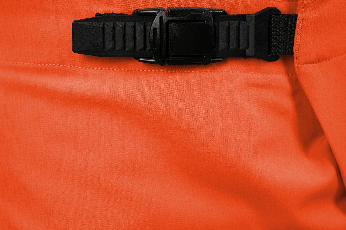 leichtes Material, eine Seitentasche mit Reißverschluss, Ratschenverschluss, Perforation zur Ventilation am Innenbein, Model ist 186 cm groß, Model trägt Größe L