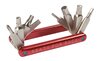 Kompaktes Multi Tool mit acht Funktionen. Das Werkzeug besteht aus fünf Innensechskantschlüsseln (Hex 2/3/4/5/6 mm), einem Rundinnensechskantschlüssel 25, einem Phillips Kreuzschraubendreher Größe 1 sowie einem 5 mm Schlitzschraubendreher. Mit diesen Werkzeug können sie alle wichtigen Schrauben am Fahrrad bedienen.