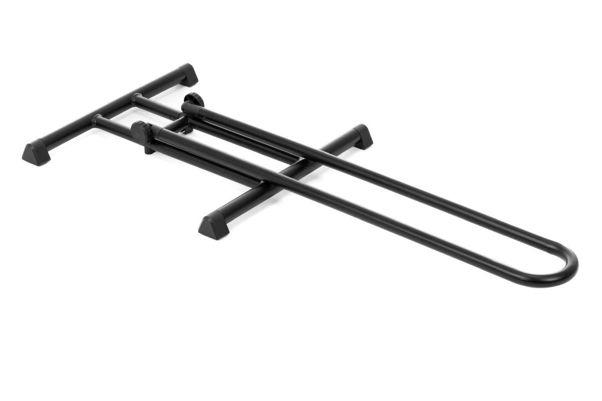 für Laufradgrößen bis 29'' und 6,5cm Breite, zusammenklappbar, rutschfeste Standfüße, versteckte Verschraubung mit dem Boden möglich