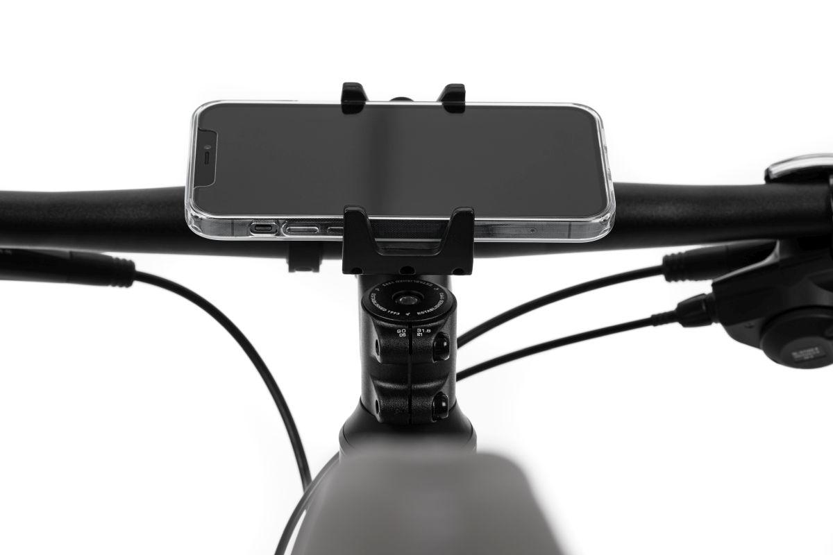 Variabel verstellbare Handyhalterung, für Breiten von 67-82mm, max. Handyhöhe: 14cm, 360° drehbar, Längsposition stufenlos verstellbar, Winkel verstellbar, Handy mittig auf dem Vorbau, fester Halt durch Silikonpads