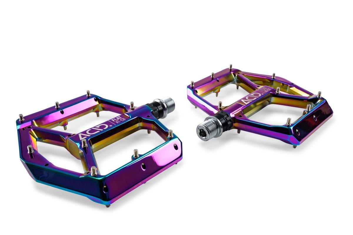 leichtes Flat-Pedal, CNC-veredelter Aluminiumkörper und CrMo Achse, angefaste Kanten für erhöhte Bodenfreiheit in Kurven, große Standfläche, extrem flache Bauweise, neun austauschbare Pins pro Seite, gedichtetes Patronengleitlager und zwei gedichtete Industrielager
