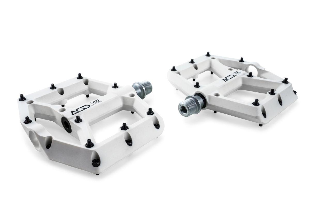 leichtes Flat-Pedal, Nylon-verstärkter-Kunststoff-Körper und CrMo Achse, angefaste Kanten für erhöhte Bodenfreiheit in Kurven, große Standfläche, extrem flache Bauweise, neun austauschbare und einstellbare Pins pro Seite, gedichtete Industrielager