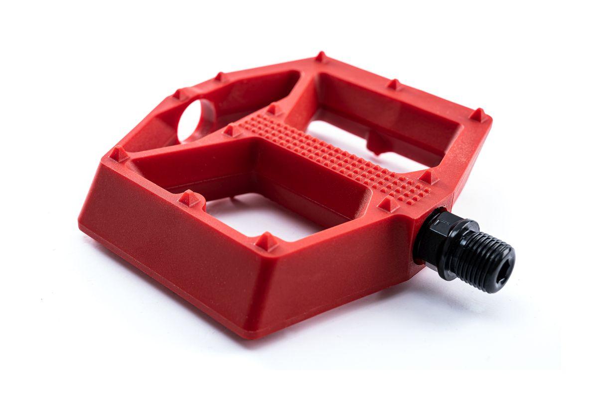 leichtes Flat-Pedal, Nylon-verstärkter-Kunststoff-Körper und CrMo Achse, angefaste Kanten für erhöhte Bodenfreiheit in Kurven, große Standfläche, flache Bauweise, zwölf Pins pro Seite, kugelgelagert