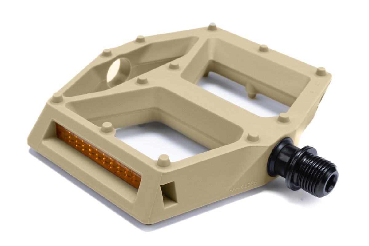 leichtes Flat-Pedal, Nylon-verstärkter-Kunststoff-Körper und CrMo Achse, angefaste Kanten für erhöhte Bodenfreiheit in Kurven, große Standfläche, flache Bauweise, zwölf Pins pro Seite, LSL-Bushing, integrierte Reflektoren