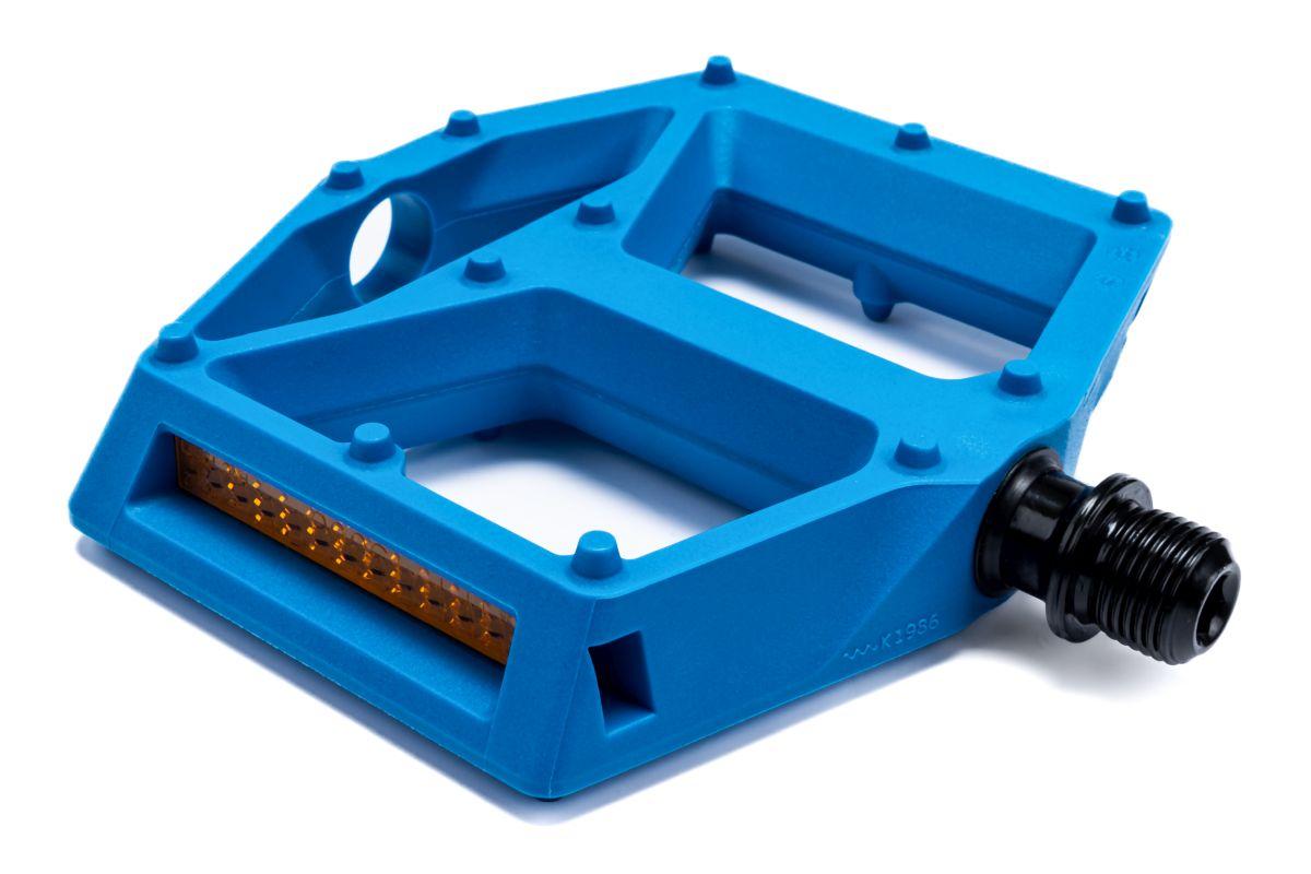 leichtes Flat-Pedal, Nylon-verstärkter-Kunststoff-Körper und CrMo Achse, angefaste Kanten für erhöhte Bodenfreiheit in Kurven, große Standfläche, flache Bauweise, zwölf Pins pro Seite, LSL-Bushing, integrierte Reflektoren