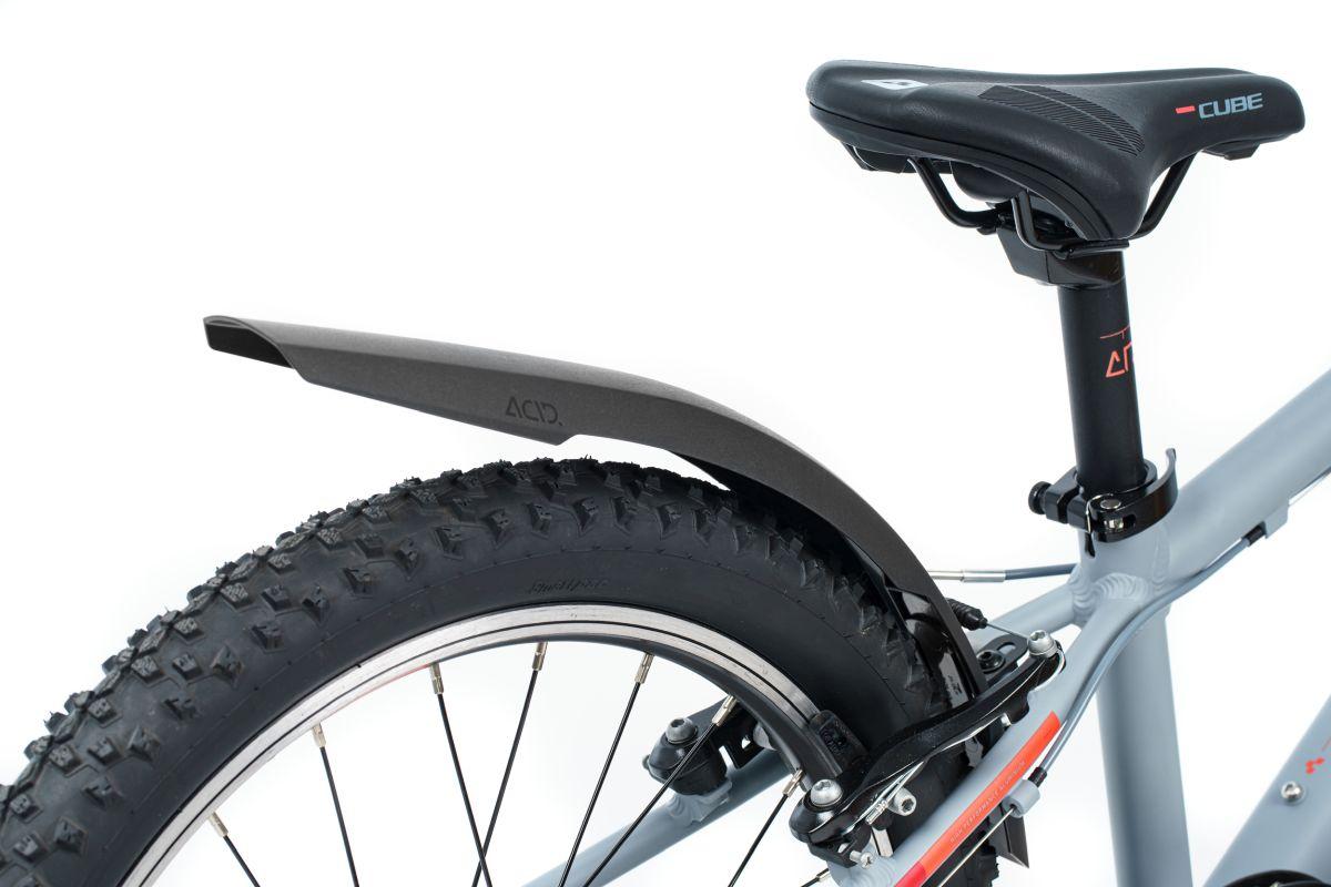 Mit dem neuen ACID Schutzblechset MUD ROOKIE haben wir Kinderschutzbleche in sportlicher Optik entwickelt, die auf unser Mudguard-Portfolio abgestimmt sind. An CUBE Bikes werden sie mit einem winkelverstellbaren Sitzstrebenadapter montiert. Für alle anderen Bikes liegt ein universelles, klassisches Winkelblech bei. Dank der seitlichen Cut-outs lassen sie sich auch an Bikes mit V-Brakes montieren. Dieses Set passt auf 18" und 20" Fahrräder mit einer maximalen Reifenbreite von 2,25".