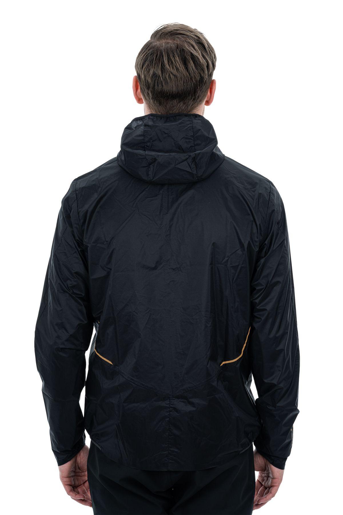 wasser- und windabweisendes Funktionsmaterial, verstellbare Kapuze mit zusätzlichem Schirm, Kapuze eignet sich zum Tragen unter dem Helm, reflektierende Elemente, elastischer Saum, Model ist 186 cm groß, Model trägt Größe L