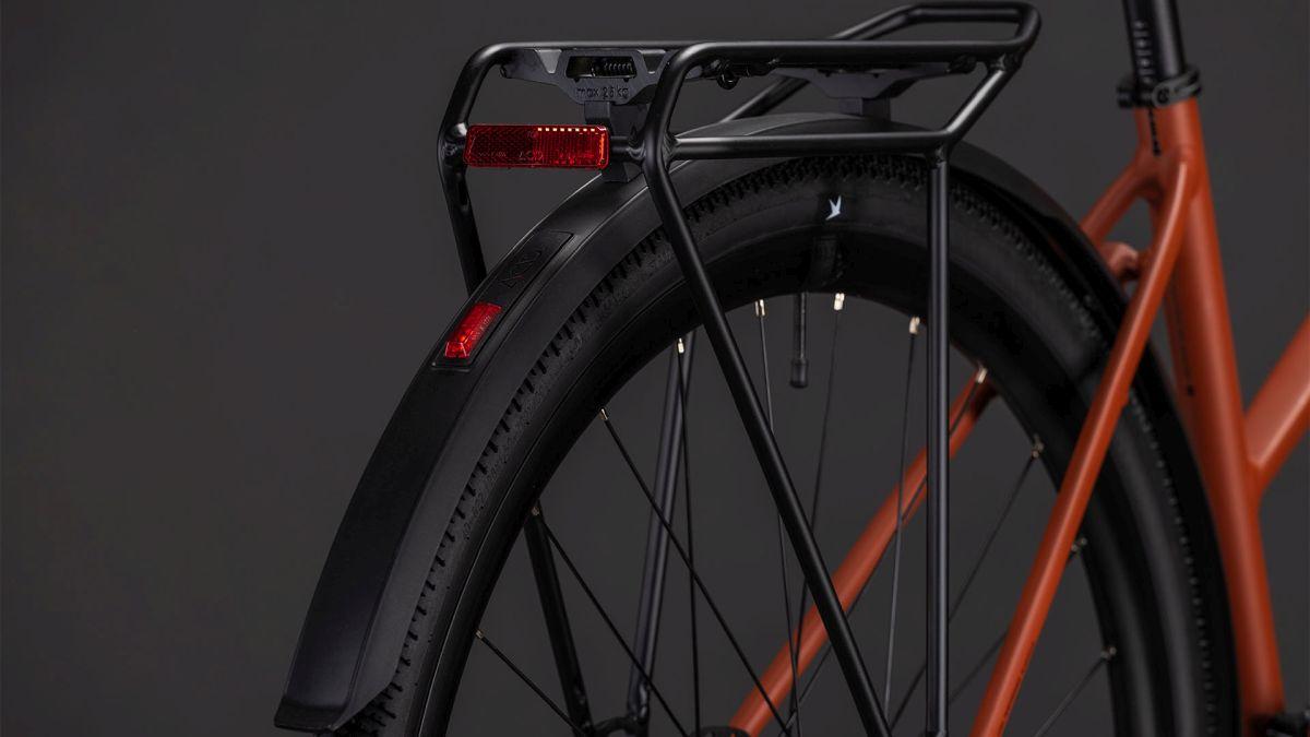 Der Trapezrahmen unseres vielseitigen Nulane wirkt auf den ersten Blick vielleicht unspektakulär, doch sein Komfort und Handling sind kaum zu übertreffen. Das Auf- und Absteigen gelingt spielend leicht, was den Alltag spürbar erleichtert. Die Kombination aus superleichten, doppelt konifizierten Aluminiumrohren und einer Vollcarbongabel hält das Gewicht niedrig und die Fahrdynamik hoch. Integrierte Schutzbleche, Gepäckträger, Beleuchtung und ein Seitenständer runden das Setup ab – perfekt für den täglichen Weg ins Büro oder entspannte Wochenendtouren. Ein echtes Highlight sind die Steckachsen vorne und hinten, die für stabile Kontrolle sorgen, egal ob mit oder ohne Gepäck unterwegs.