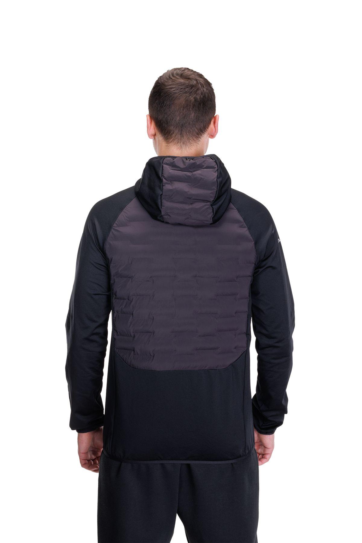 partiell wattiert, seitliche Eingriffstaschen mit Reißverschluss, mit Kapuze, sportliche Passform, durchgehender Frontreißverschluss, elastischer Saum, Logo-Druck, Model ist 182 cm groß, Model trägt Größe M