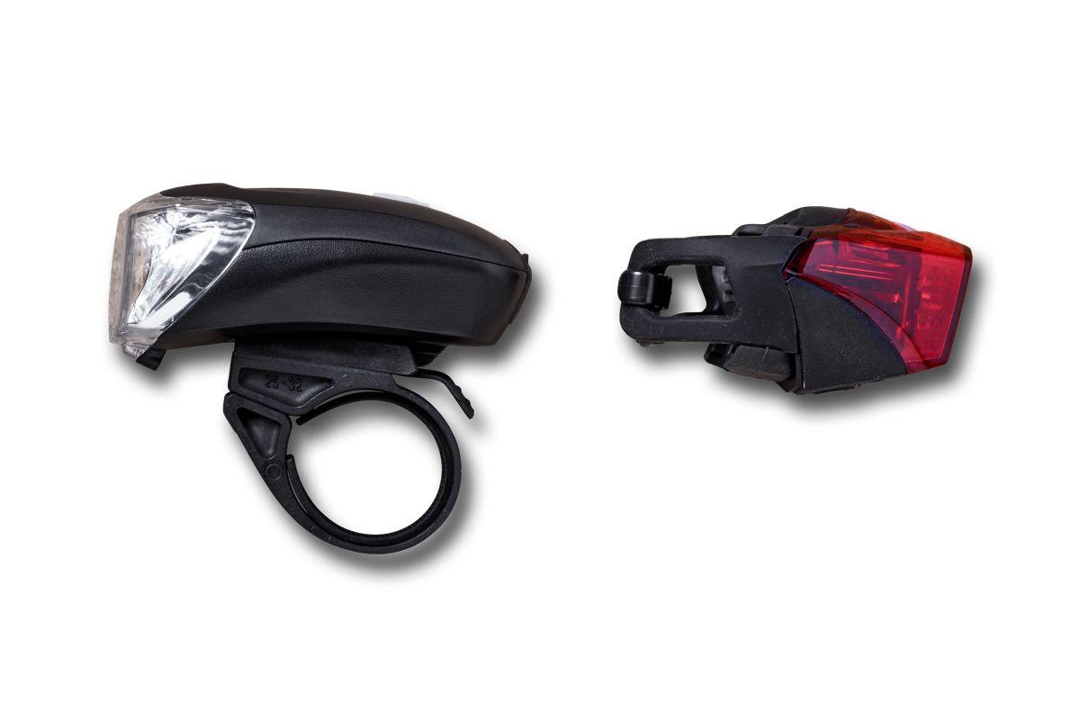 LED-Frontlicht, StVZO zugelassen, umschaltbar 35/15 Lux, USB aufladbarer, integrierter Lithium-Polymer-Akku, spritzwassergeschützt, einfache Montage, LED-Rücklicht, StVZO zugelassen, integrierter Lithium-Polymer-Akku, winkelverstellbare Halterung, werkzeuglos montierbar mit Schnellverschluss, Micro-USB Kabel inklusive