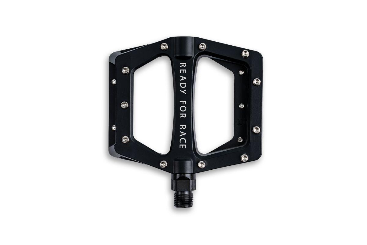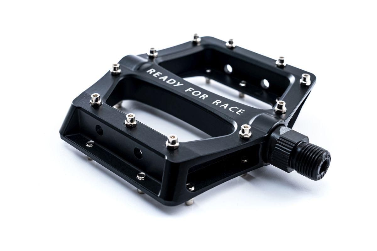 Die leichten Flat-Pedale sind aus Aluminium hergestellt und werden mit einer CrMo-Achse verbaut. Die Anti-Rutsch-Pins sind austauschbar und bieten besten Halt am Fahrrad.