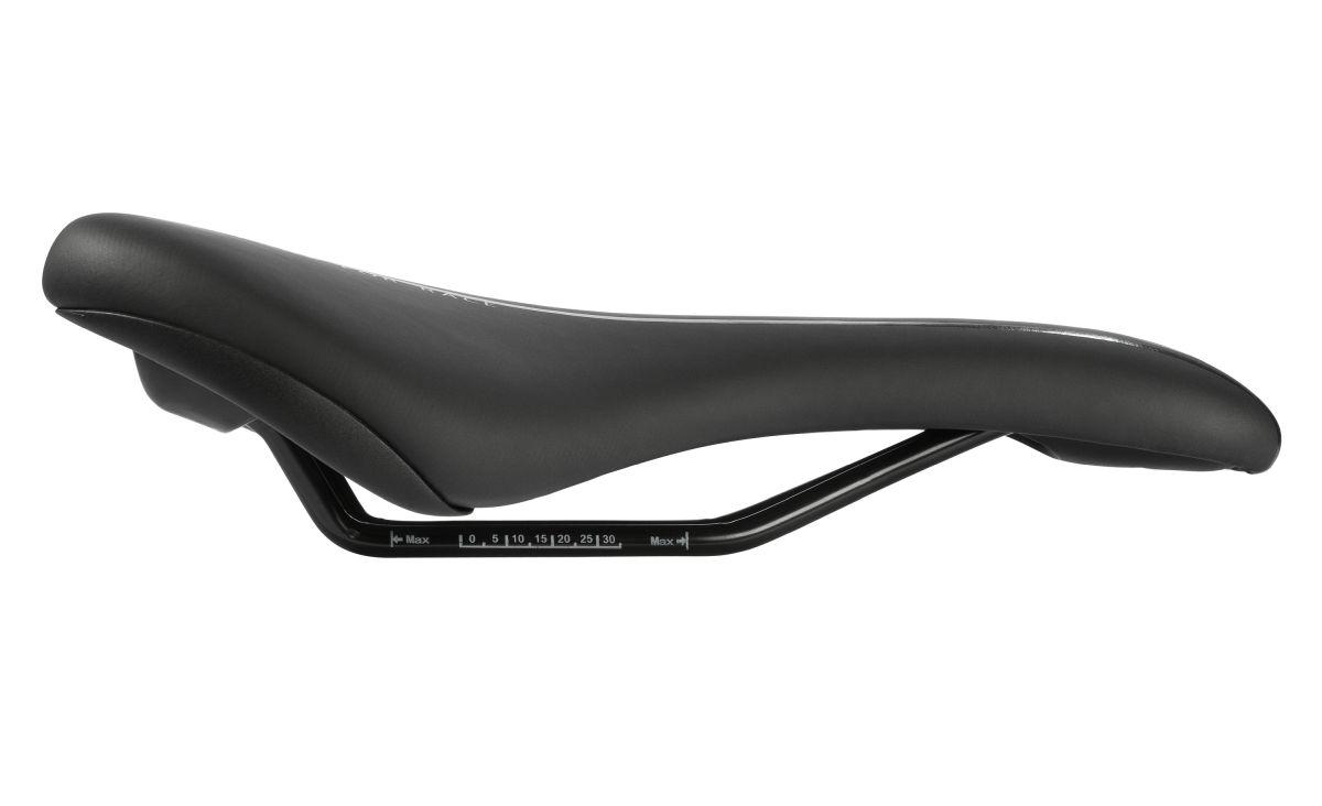 erhöhtes Heck für einen guten Halt bei längeren bergauf Abschnitten, Dual-Density Technologie für die Entlastung an den Sitzknochen, durchgängiger Cut-Out in der Sattelschale für den Genitalbereich
